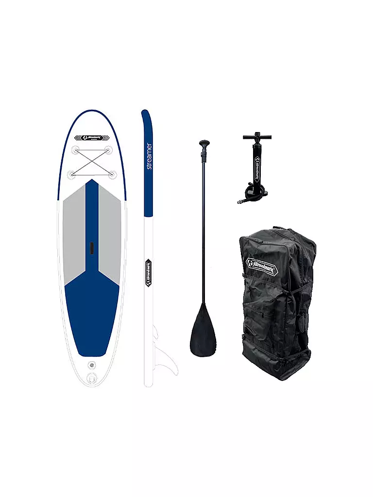 De nieuwe Allroundmarin SUP-modellen presenteren zich in een nieuw, slank ontwerp en bieden plezier, ontspanning en een sportieve afwisseling van de dagelijkse routine. Of je nu een beginner, gevorderde of een kind bent dat erop speelt, onze modellen zijn allrounders op het water. Dankzij de modernste fusietechnologie en een wanddikte van 1,5 mm, Drop Stitch, kunnen we je een kwalitatief hoogwaardig product aanbieden dat met zijn 3 afneembare vinnen de koers op het water optimaal houdt en door zijn hoogte van 15 cm uitblinkt in drijfvermogen en stabiliteit. Bij het model STREAMER heb je zelfs de mogelijkheid om in de 4 D-ringen een optionele stoel te bevestigen.