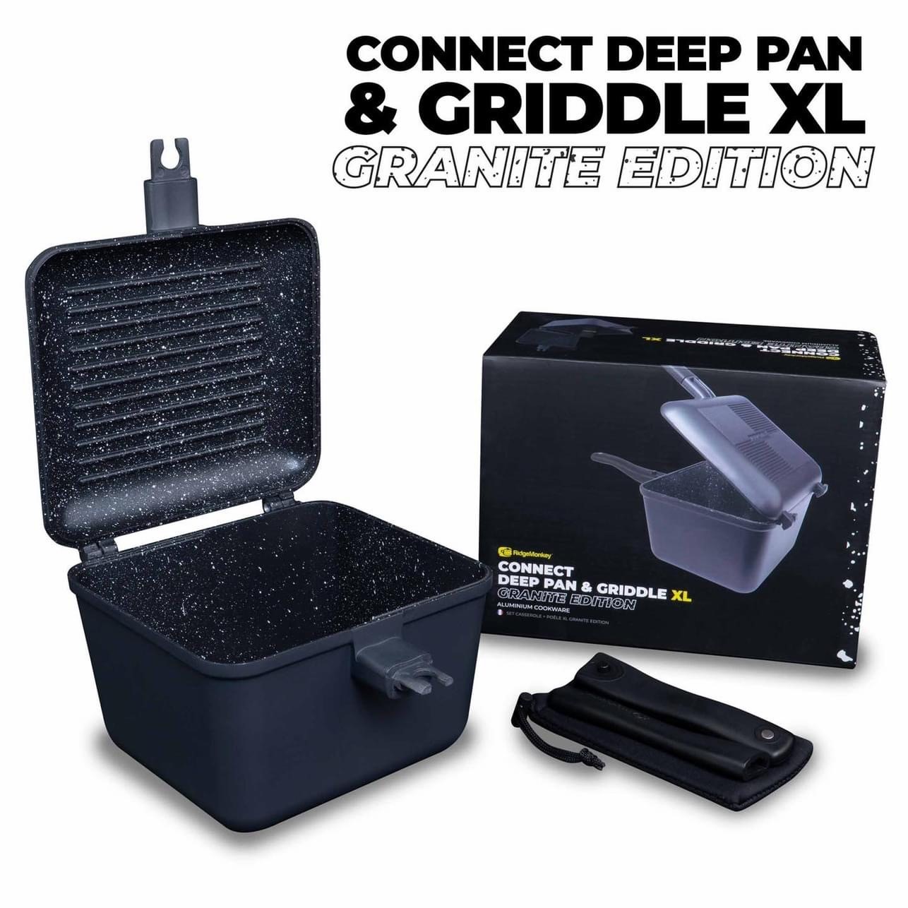 De Connect Deep Pan & Griddle Granite Edition heeft afneembare cool-touch handgrepen en een afneembaar scharniersysteem dat één pan in twee verandert – een diepe pan en een aparte grillpan. De grillpan fungeert als deksel op de diepere pan en kan worden losgemaakt om een aparte pan te worden, zodat je twee hoeveelheden voedsel tegelijk kunt bereiden. De grillpan is ook uitwisselbaar met de RidgeMonkey Connect Sandwich Toaster Granite Edition. Onze geheel nieuwe granite style coating maakt onze pannen sterker, duurzamer en biedt verbeterde antiaanbak eigenschappen, waardoor compact kookgerei naar een geheel nieuw niveau wordt getild. Verkrijgbaar in standaard en XL maten.